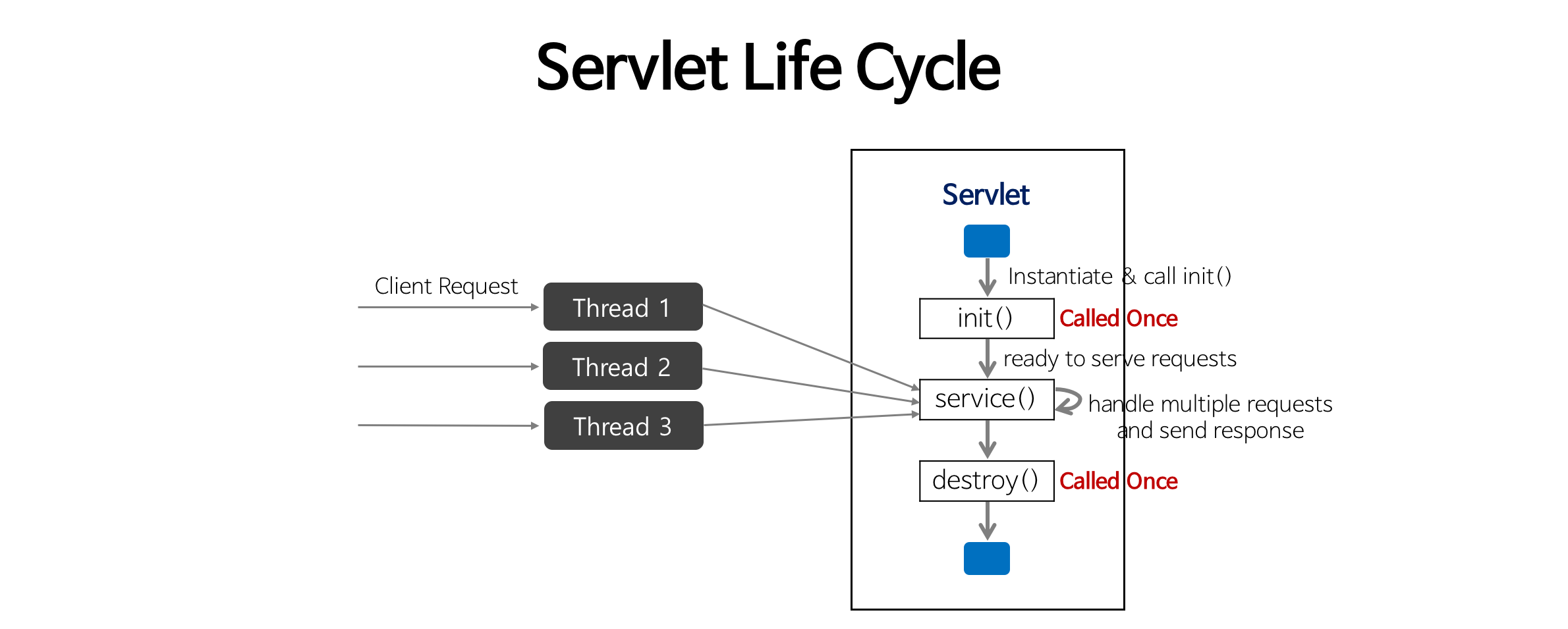 * LifeCycle을 코드로 수행해보면, 객체는 하나, 스레드는 여러 개가 생성되어 서비스한다. (여러 사용자 요청 처리)